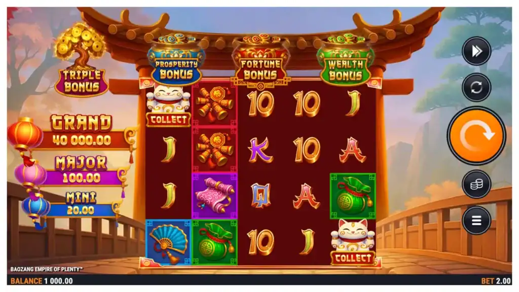 Baozang Empire of Plenty™ delivers a refined slot experience centered around coin accumulation and jackpot escalation. Although the layout remains classic with 40 paylines, the interaction between coins and Collect symbols introduces dynamic payout potential. As coins fill the pots above the reels, the anticipation of triggering a bonus intensifies. Consequently, the gameplay feels both methodical and rewarding.